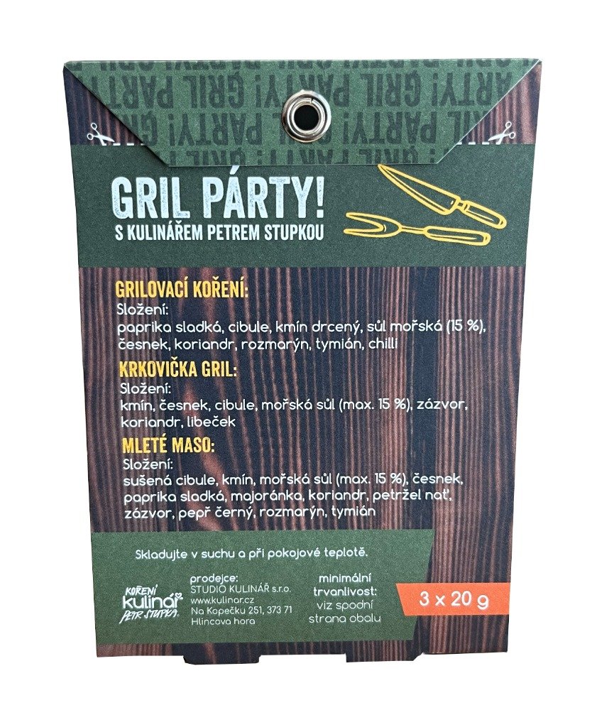 | Složení: | kořenící přípravek sypký – 3 druhy 3x 20 g Složení: Grilovací koření – paprika sladká, cibule, kmín drcený, sůl mořská (15%), česnek, koriandr, rozmarýn, tymián, chilli Krkovička gril – kmín, česnek, cibule, mořská sůl (max. 15%), zázvor, koriandr, libeček Mleté maso – sušená cibule, kmín, mořská sůl (max. 15%), česnek, paprika sladká, majoránka, koriandr, petržel nať, zázvor, pepř černý, rozmarýn, tymián |